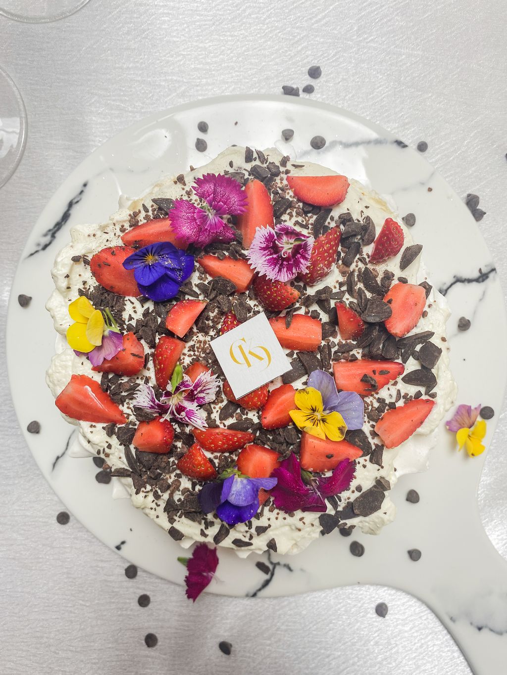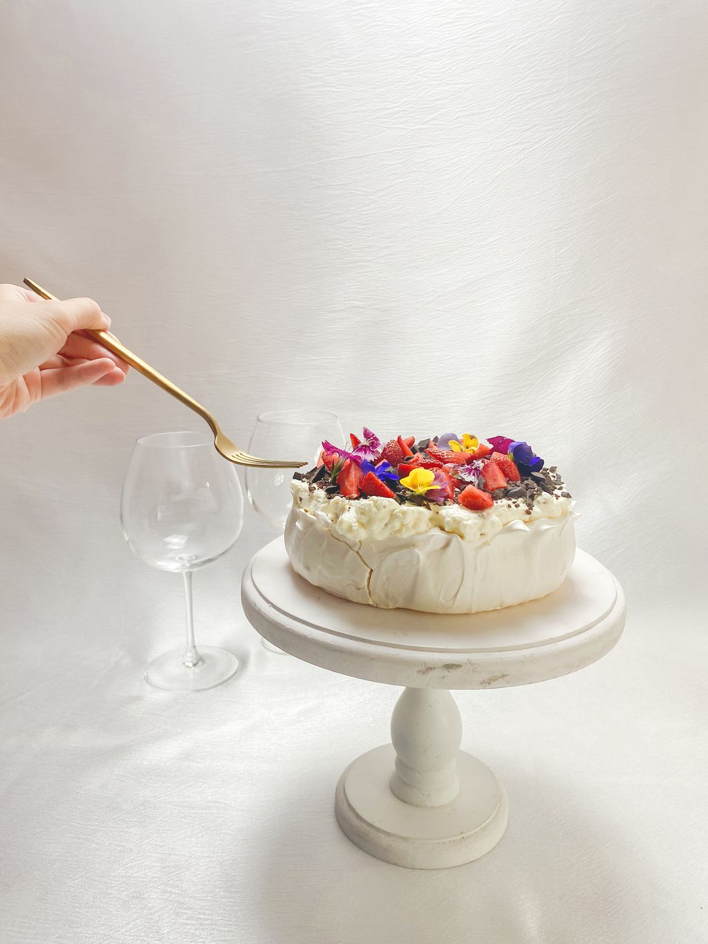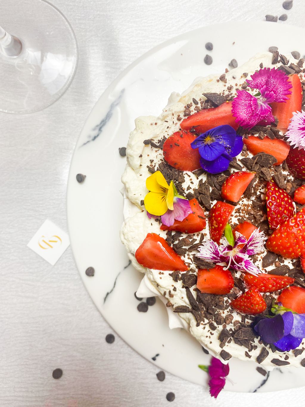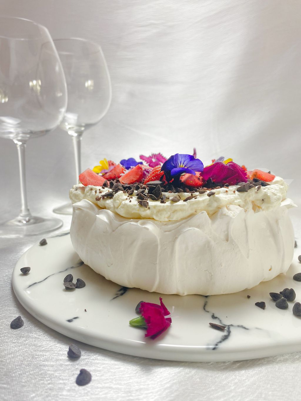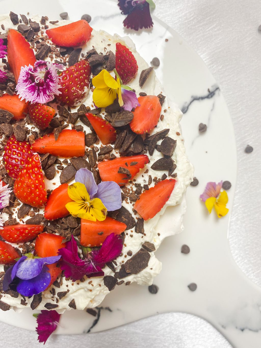 Freshly baked meringue paired with fresh whipped cream and topped with fresh strawberries and chocolate chunks. This dessert are great for afternoon tea!