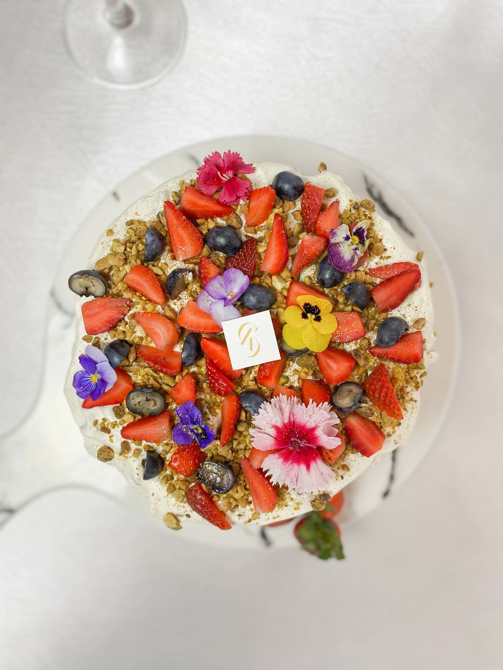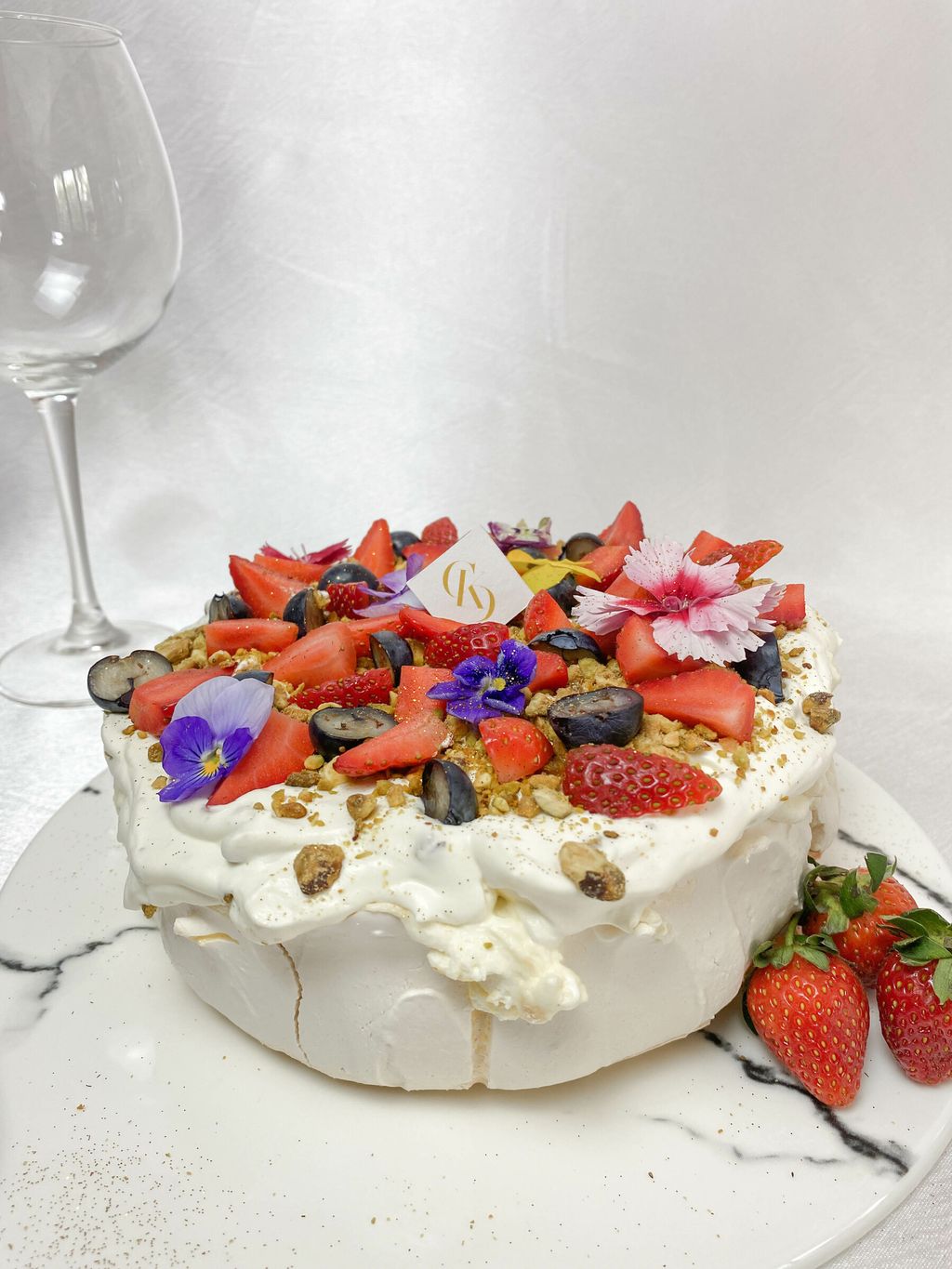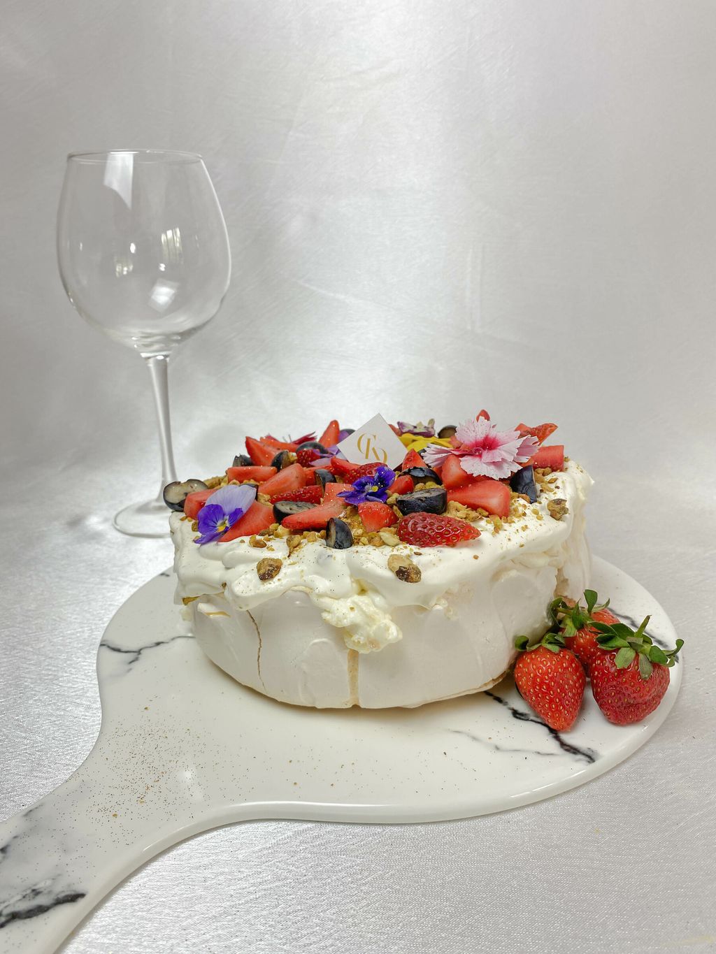 Pavlova paired with freshly whipped cream mixed with cocoa nibs and topped with fresh strawberries along with pistachio nuts. A light and fresh dessert, perfect for tea time treat!