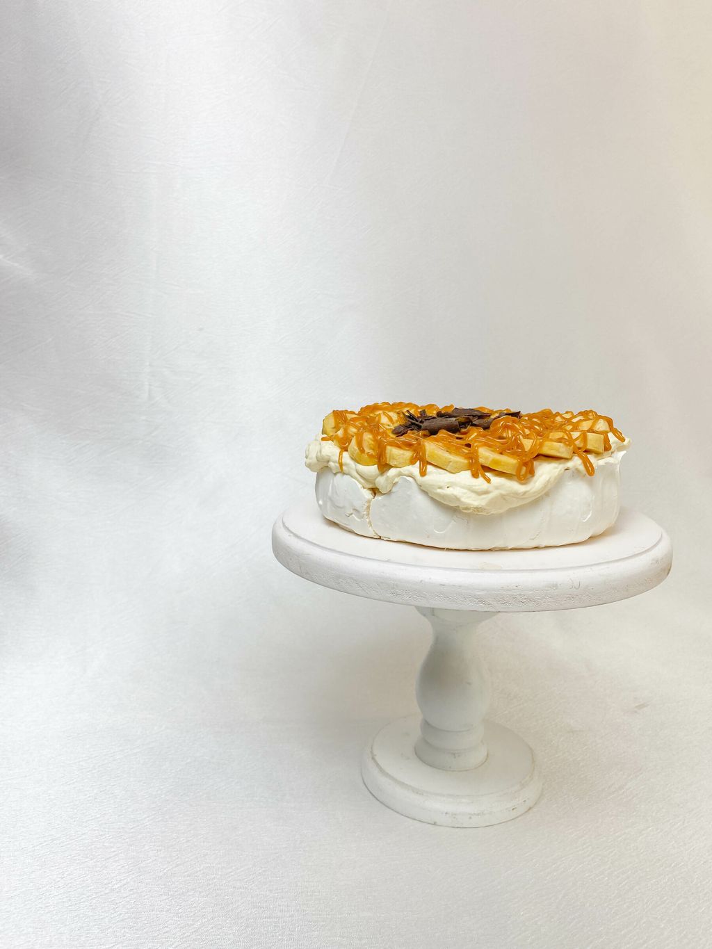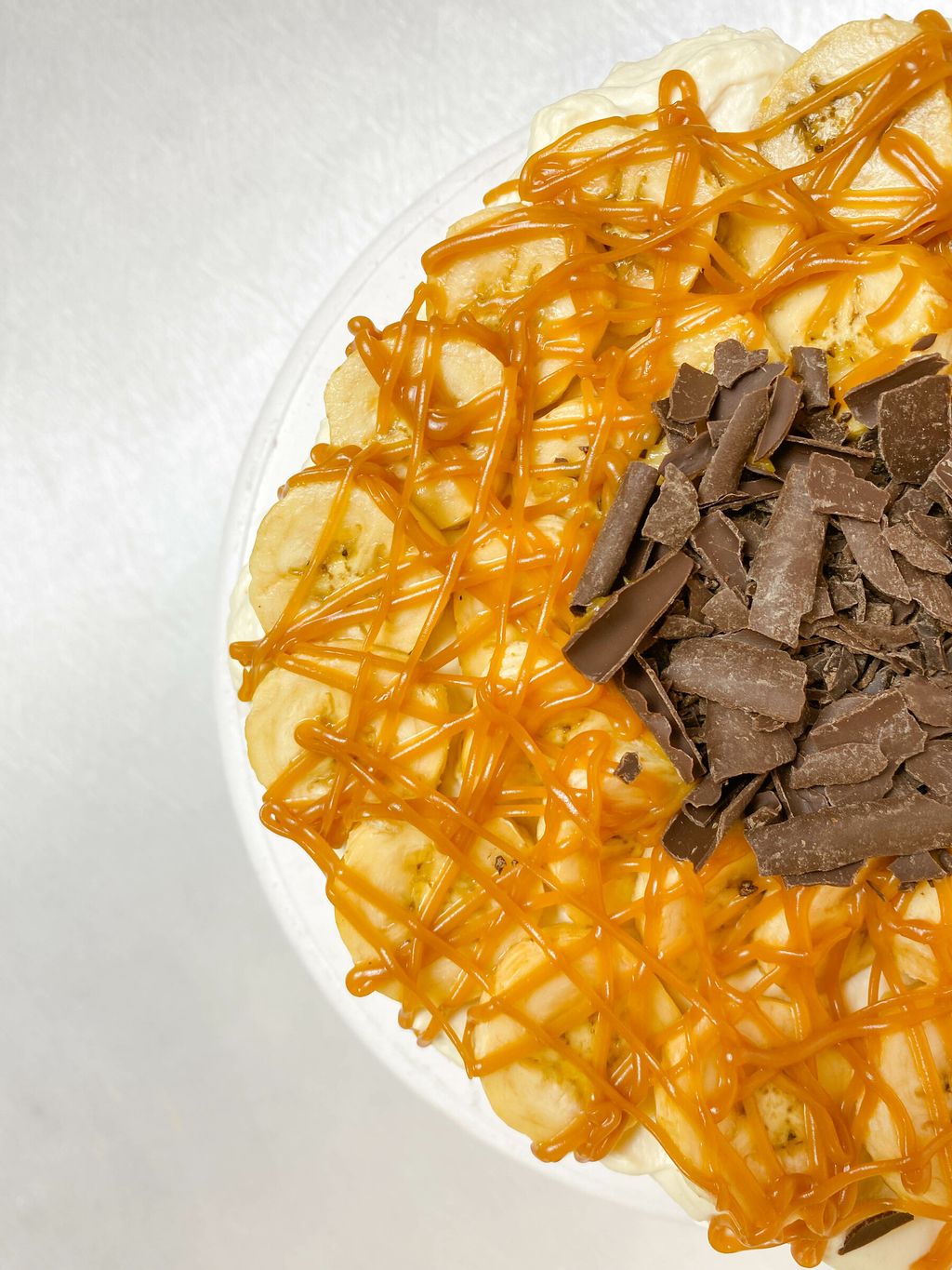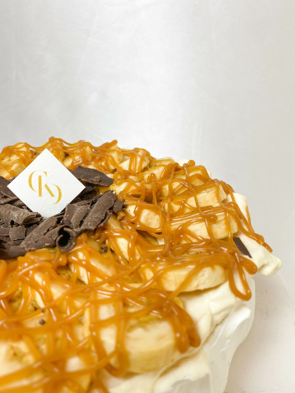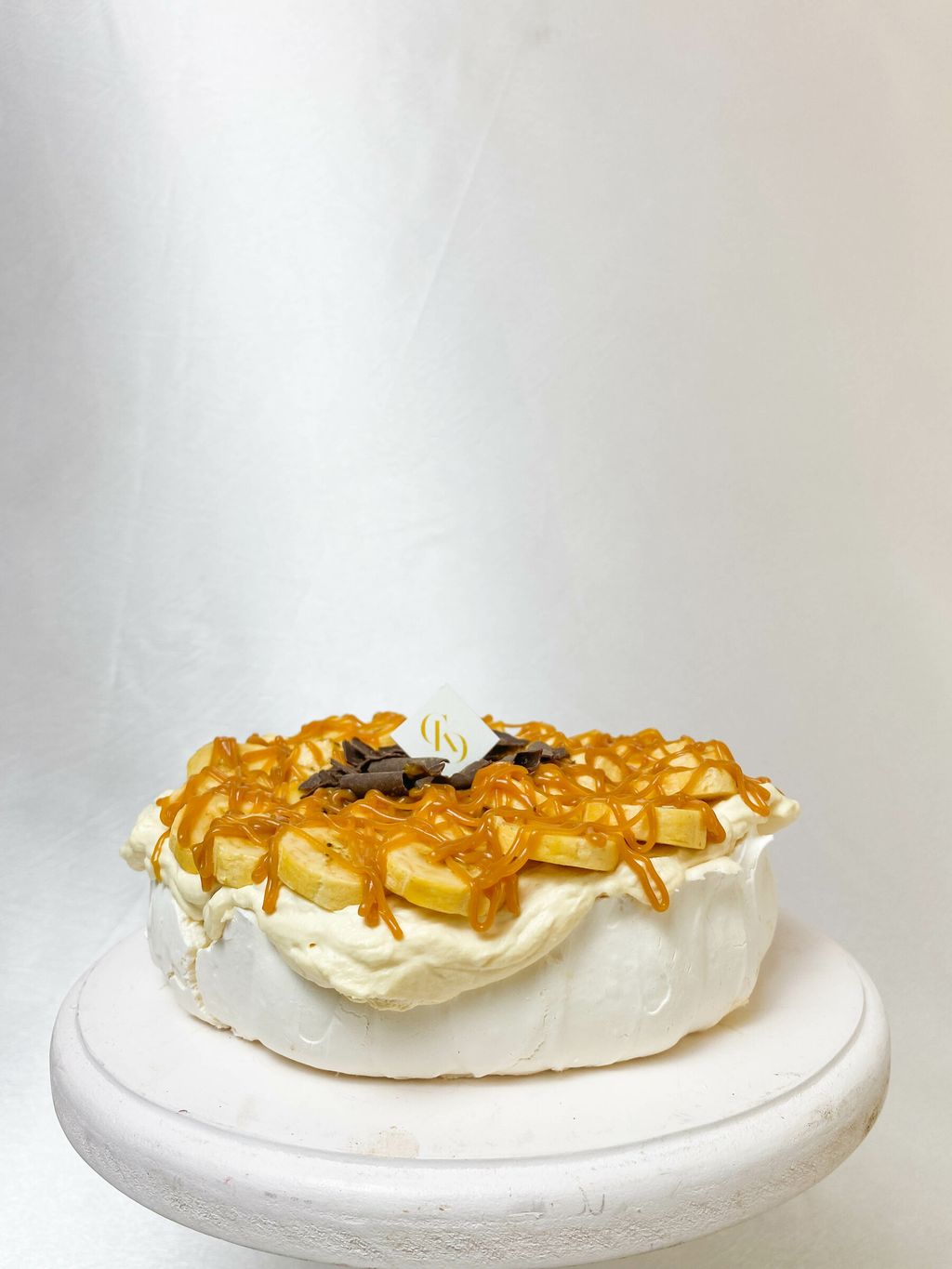 Pavlova paired with fresh whipped cream mixed with cocoa nibs and caramel sauce topped with fresh banana slices along with Biscoff crunch, chocolate shavings and drizzled with plenty of salted caramel sauce.